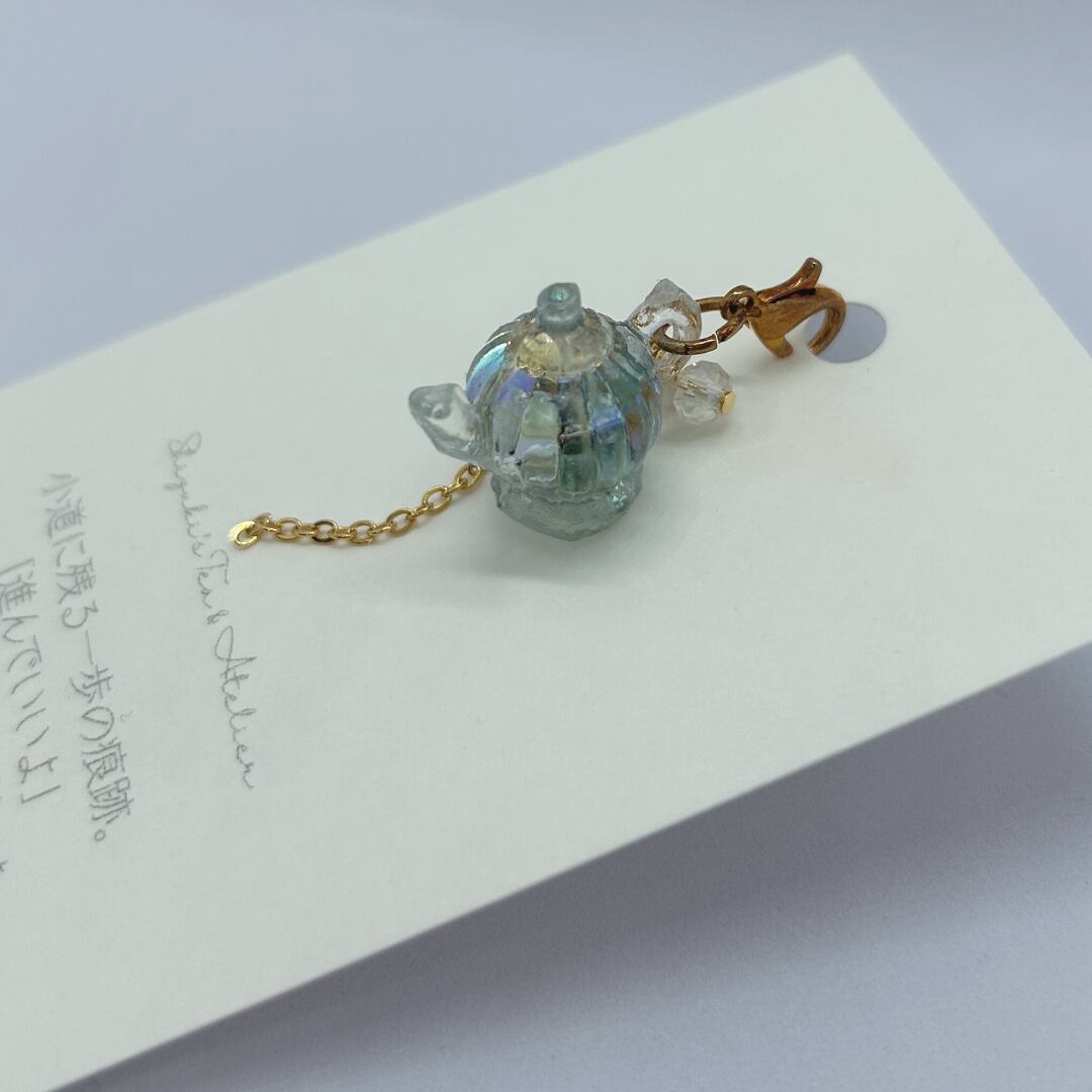 淡いブルーのティーポットに、きらめく蹄鉄チャームが揺れて、